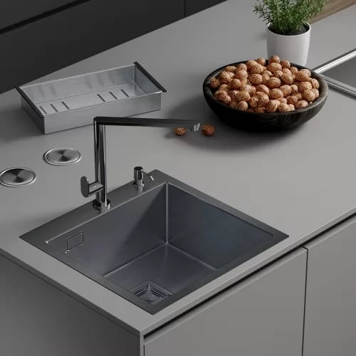 Кухонная мойка Roxen Simple 45 PVD Black 45х45 с ролл-матом и дозатором в комплекте. Удобная модель с глубокой чашей и квадратным отверстием слива, сочетает в себе стильный современный дизайн и отличные эксплуатационные характеристики. Мойка изготовлена из аустенитной низкоуглеродистой стали марки AISI 304, которая обладает устойчивостью к коррозии, окислению и перепаду температур. Уникальное покрытие Bruch Tech является защитным слоем, устойчивым к истиранию, появлению царапин и механических повреждений. Отличные шумопоглощающие характеристики мойки обеспечиваются шумоподавляющим составом Silent Protection и шумопоглощающими пластинами Silent Protection, которые располагаются по всей чаше мойки.
