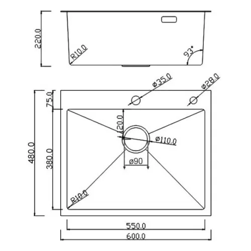 - В мойке сделано 2 заводских отверстия для смесителя и дозатора