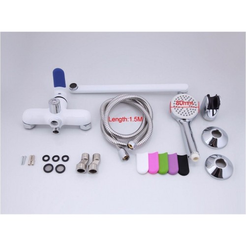 Frap смеситель для ванны, поворотный излив 35см, однорычажный, керамический катридж 35mm, переключатель в корпусе 180 градусов, комплектующие(душевой шланг 1,5м., лейка, кронштейн для лейки, эксцентрики, прокладки, чашечки) цвет белый, корпус латунный. В комплекте шесть сменных разноцветных накладок.